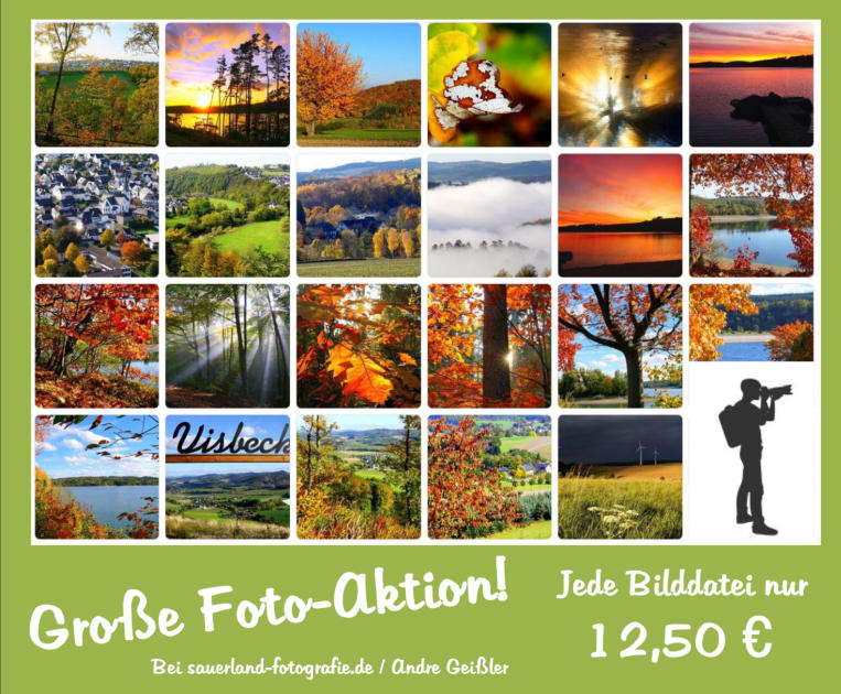 8.000 schöne Impressionen aus dem Sauerland in übersichtlichen Alben auf meiner flickr - Seite Landschaft & Natur - Städte & Dörfer - Architektur - Veranstaltungen: Auf meiner Seite habe ich über 8.000 Aufnahmen unterschiedlichster Art aus dem Großteil der Regionen im Sauerland als Vorschaubild veröffentlicht. Gehen Sie hier auf eine Bilderreise und suchen sich für Ihre Zwecke Ihre Lieblingsmotive aus: www.flickr.com/photos/sauerland- fotografie/albums